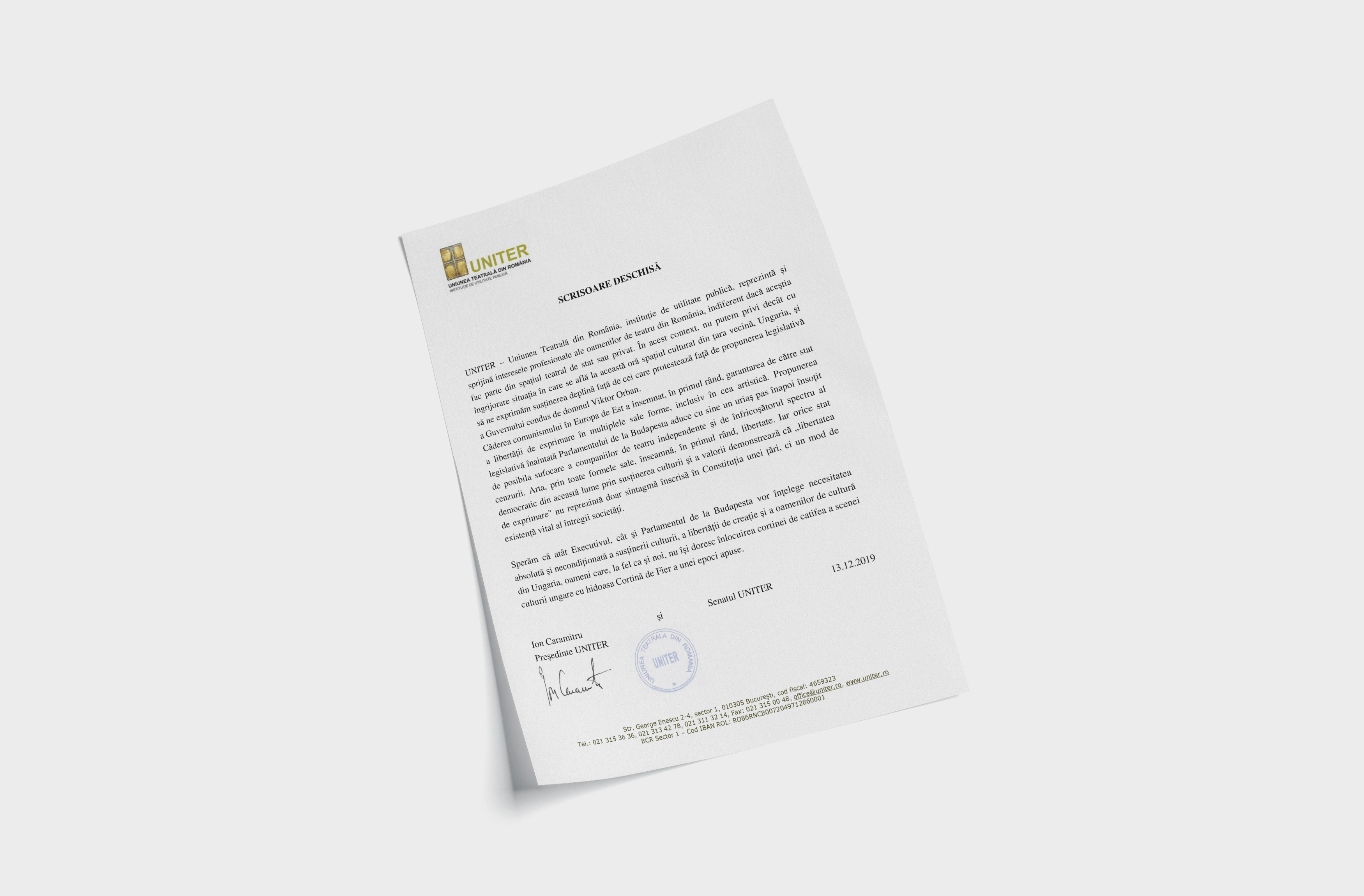 UNITER – Uniunea Teatrală din România, instituție de utilitate publică, reprezintă și sprijină interesele profesionale ale oamenilor de teatru din România, indiferent dacă aceștia fac parte din spațiul teatral de stat sau privat. În acest context, nu putem privi decât cu îngrijorare situația în care se află la această oră spațiul cultural din țara vecină, Ungaria, și să ne exprimăm susținerea deplină față de cei care protestează față de propunerea legislativă a Guvernului condus de domnul Viktor Orban.